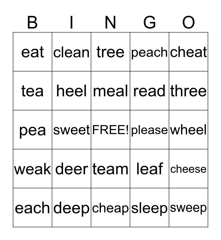 This bingo card has a free space and 24 words: deer, deep, meal, each, cheat, eat, tea, clean, please, team, read, pea, leaf, cheese, heel, sleep, wheel, tree, three, sweet, sweep, weak, peach and cheap.