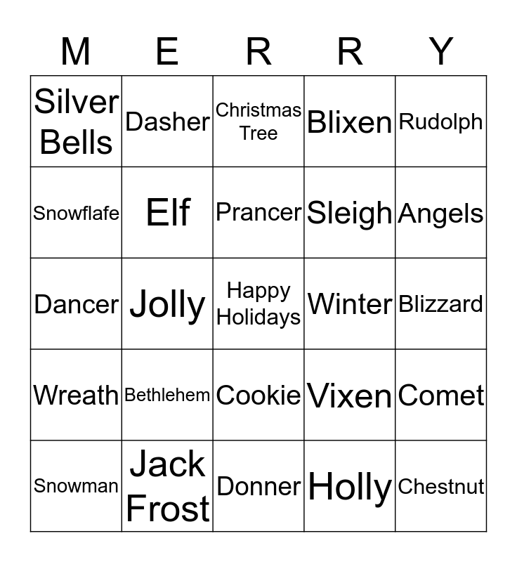 This bingo card has a free space and 34 words: Ornament, Holly, Baby Jesus, Cupid, Wreath, Elf, Rudolph, Snowman, Dasher, Mistletoe, Prancer, Christmas Tree, Manger, Toy Shoppe, Winter, Angels, Jack Frost, Dancer, Bethlehem, Vixen, Cookie, Candy Cane, Silver Bells, Blizzard, Donner, Chestnut, Blixen, Gifts, Sleigh, Snowflafe, Santa, Jolly, Comet and Ms.Claus.