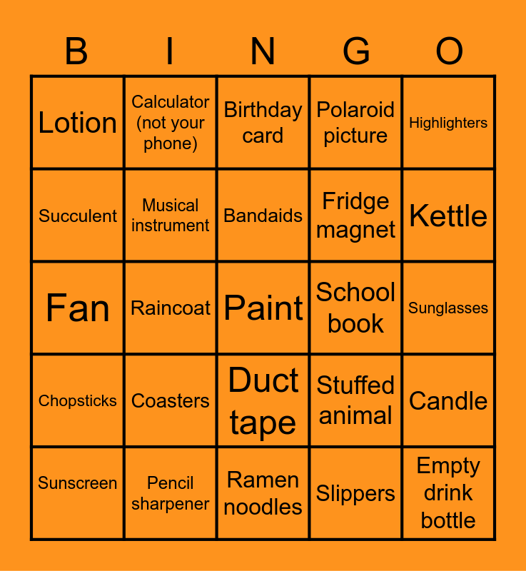 This bingo card has 25 words: Chopsticks, Pencil sharpener, Paint, Slippers, Highlighters, Lotion, Calculator (not your phone), Birthday card, School book, Candle, Succulent, Musical instrument, Ramen noodles, Stuffed animal, Kettle, Sunscreen, Raincoat, Bandaids, Fridge magnet, Sunglasses, Fan, Coasters, Duct tape, Polaroid picture and Empty drink bottle.