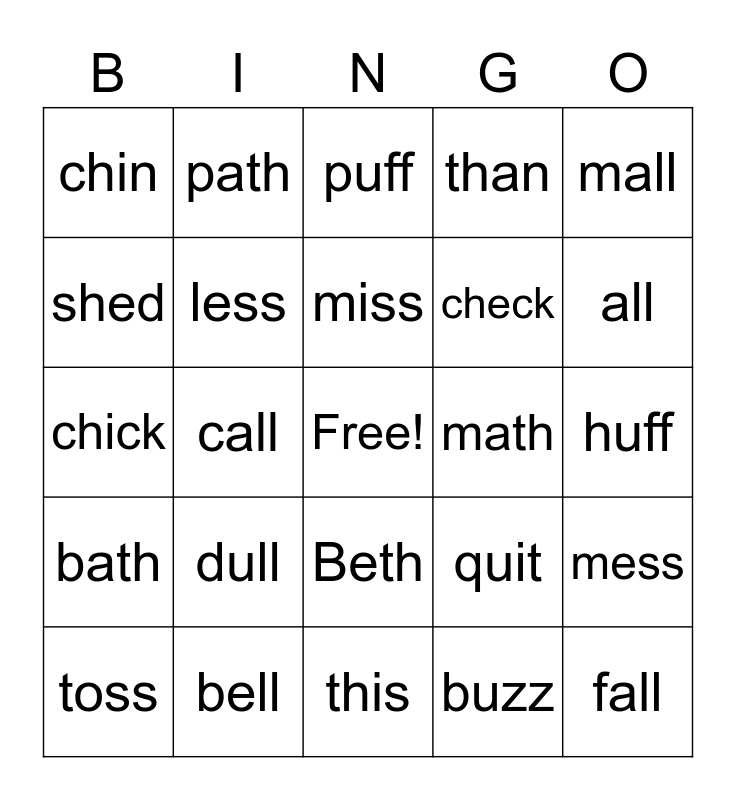 This bingo card has a free space and 24 words: dull, bell, miss, toss, mall, chin, shed, path, math, Beth, check, chick, quit, mess, less, buzz, huff, puff, all, call, fall, bath, than and this.