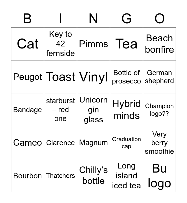 This bingo card has 71 words: Free!, Key to 42 fernside, Bank card, Hot water bottle, Chilly’s bottle, Air force, Tea, Pornstar martini, Bottle of prosecco, Cornetto, Bourbon, Oaty, German shepherd, Cat, Nossy, Bandage, Graduation cap, Beach bonfire, Red sofa, Champion logo??, Clarence, Unicorn gin glass, Very berry smoothie, Bagel, Birthday cake, Hooch, Fake eyelash, Kenneth ghost, Glasses, Princess crown, Thatchers, Netlfix, Daim, Snakebite, Long island iced tea, 21 September, No 42, Fake tan, Peugot, Nandos, Magnum, Bu logo, Cameo, Vinyl, Straightners, Pam shipman, Smithy, Toast, Lost, Lollipop, Mamma mia, Dark fruits, Hybrid minds, Waterloo Road, Rugby ball, Tik tok, Vinyl, Grapefruit, Callipo, Mayonaise, Lightening bolt, Pizza – Chicago town, starburst – red one, Beer pong, Marmite, Toothbrush, Pimms, Starbucks, Eddie, Sleepover and Freddie no..