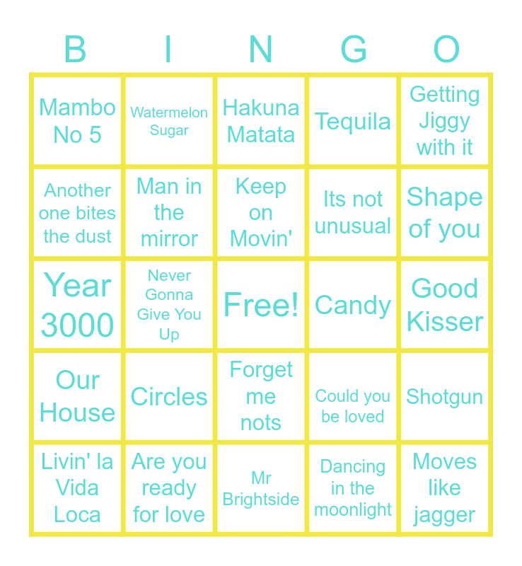 This bingo card has a free space and 29 words: Livin' la Vida Loca, Stayin Alive, Never Gonna Give You Up, September, Mambo No 5, Hakuna Matata, Man in the mirror, Circles, Candy, Are you ready for love, Good Kisser, Moves like jagger, Mr Brightside, Dancing in the moonlight, Shape of you, Friday, Forget me nots, Our House, Getting Jiggy with it, Year 3000, Could you be loved, I'm your man, Its not unusual, Another one bites the dust, Tequila, Watermelon Sugar, Shotgun, Keep on Movin' and Celebration.
