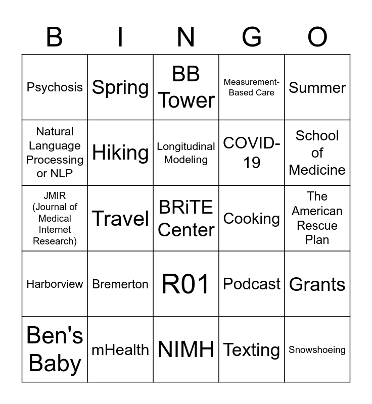 This bingo card has a free space and 24 words: Bremerton, mHealth, Longitudinal Modeling, Ben's Baby, Summer, Psychosis, Natural Language Processing or NLP, Spring, Cooking, R01, COVID-19, JMIR (Journal of Medical Internet Research), Podcast, Grants, Hiking, Texting, The American Rescue Plan, BB Tower, School of Medicine, Travel, Snowshoeing, Harborview, Measurement-Based Care and NIMH.
