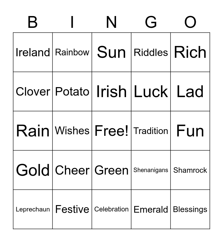 This bingo card has a free space and 46 words: St. Patty, Blessings, Buckle, Celebration, Cheer, Clover, Rainbow, Festival, Clover, Peach, Potato, Riddles, Shamrock, Shenanigans, Spring, Spud, Irish, Tradition, Treasure, Rich, Wishes, Emerald, Ireland, Luck, Happy, Lad, Leprechaun, Magic, Green, Gold, Paddy, Best, Blessed, Happy, Joy, Festive, Fun, Flowers, Jig, Charm, Patrick, Sun, Rain, Hat, Beard and Saint.