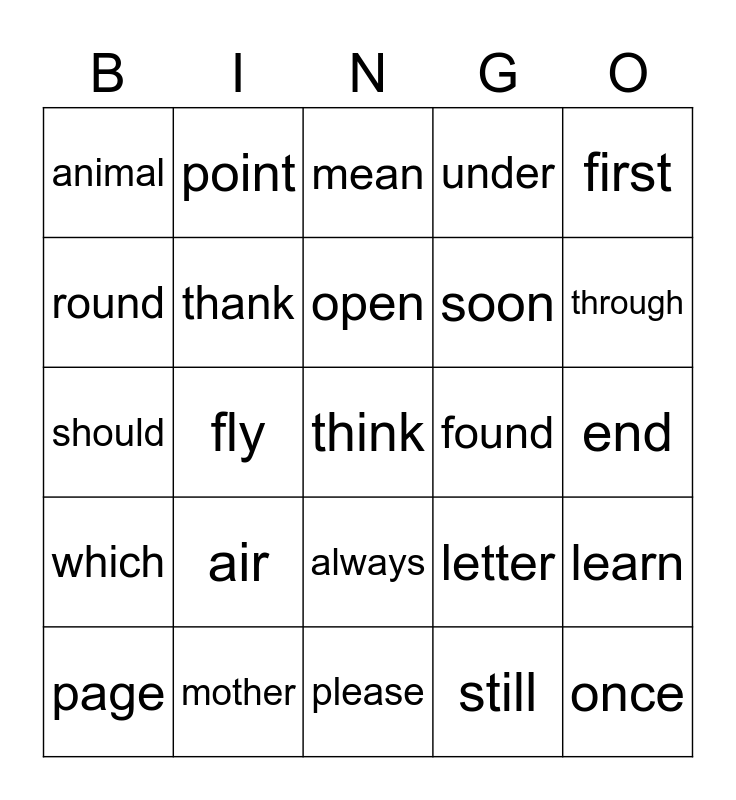 This bingo card has a free space and 24 words: air, mother, open, page, first, animal, round, point, found, always, soon, should, letter, learn, thank, still, end, mean, through, fly, once, which, under and please.