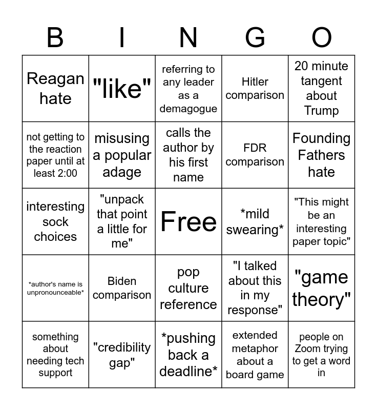 This bingo card has a free space and 24 words: Biden comparison, "credibility gap", calls the author by his first name, something about needing tech support, 20 minute tangent about Trump, Reagan hate, not getting to the reaction paper until at least 2:00, "like", *mild swearing*, pop culture reference, FDR comparison, interesting sock choices, "I talked about this in my response", "game theory", misusing a popular adage, extended metaphor about a board game, "This might be an interesting paper topic", referring to any leader as a demagogue, Founding Fathers hate, "unpack that point a little for me", people on Zoom trying to get a word in, *author's name is unpronounceable*, Hitler comparison and *pushing back a deadline*.