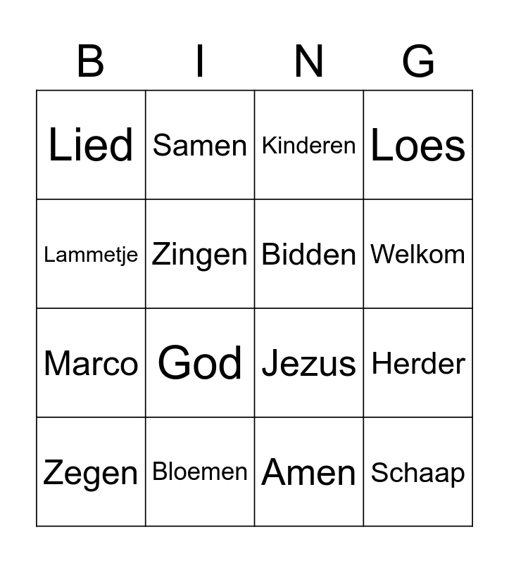 This bingo card has 16 words: Bloemen, Herder, Kinderen, Lied, Marco, Samen, Jezus, Amen, Lammetje, Zingen, Zegen, Loes, God, Welkom, Bidden and Schaap.