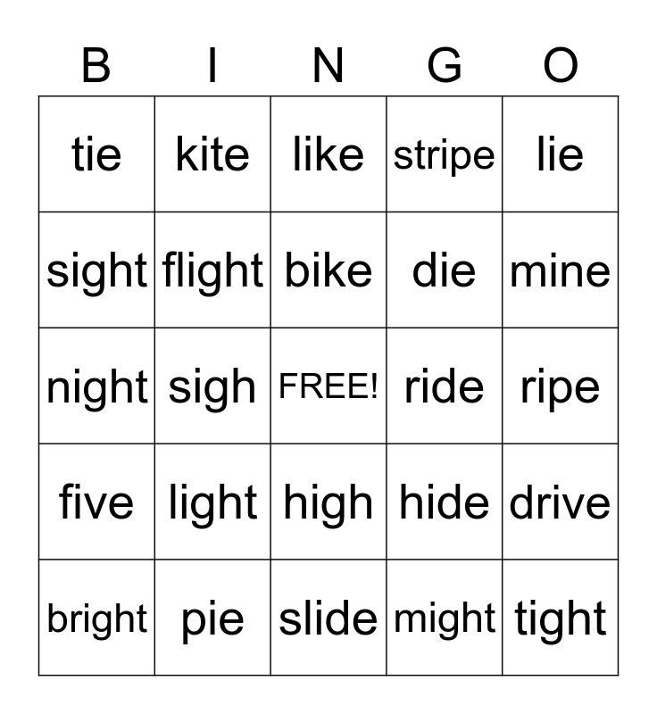 This bingo card has a free space and 24 words: light, pie, bike, bright, lie, tie, sight, kite, ride, high, die, night, hide, drive, flight, might, ripe, like, mine, sigh, tight, five, stripe and slide.