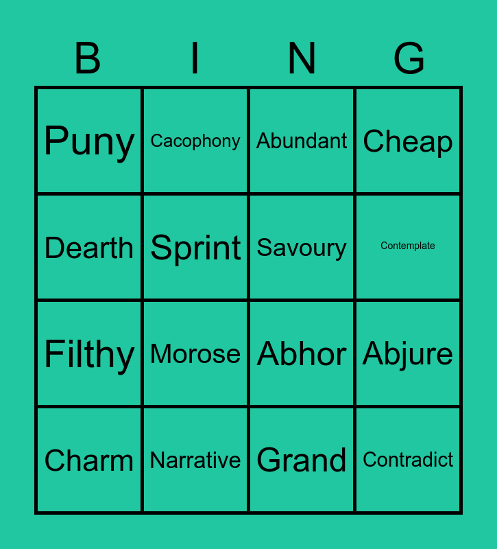 This bingo card has 24 words: Astonishing, Accurate, Contemplate, Bombastic, Dearth, Puny, Sprint, Cacophony, Narrative, poor, Filthy, Abhor, Illicit, Easy, Savoury, Counterfeit, Grand, Abundant, Morose, Abjure, Charm, Contradict, Cheap and Disdain.