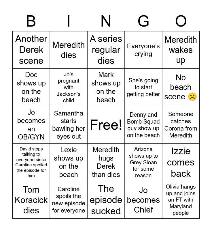 This bingo card has a free space and 24 words: Lexie shows up on the beach, Caroline spoils the new episode for everyone, Mark shows up on the beach, Tom Koracick dies, Meredith wakes up, Another Derek scene, Doc shows up on the beach, Meredith dies, Denny and Bomb Squad guy show up on the beach, Meredith hugs Derek than dies, She’s going to start getting better, Jo becomes an OB/GYN, Arizona shows up to Grey Sloan for some reason, Izzie comes back, Jo’s pregnant with Jackson’s child, Jo becomes Chief, Someone catches Corona from Meredith, A series regular dies, No beach scene ☹️, Samantha starts bawling her eyes out, Olivia hangs up and joins an FT with Maryland people, David stops talking to everyone since Caroline spoiled the episode for him, Everyone’s crying and The episode sucked.