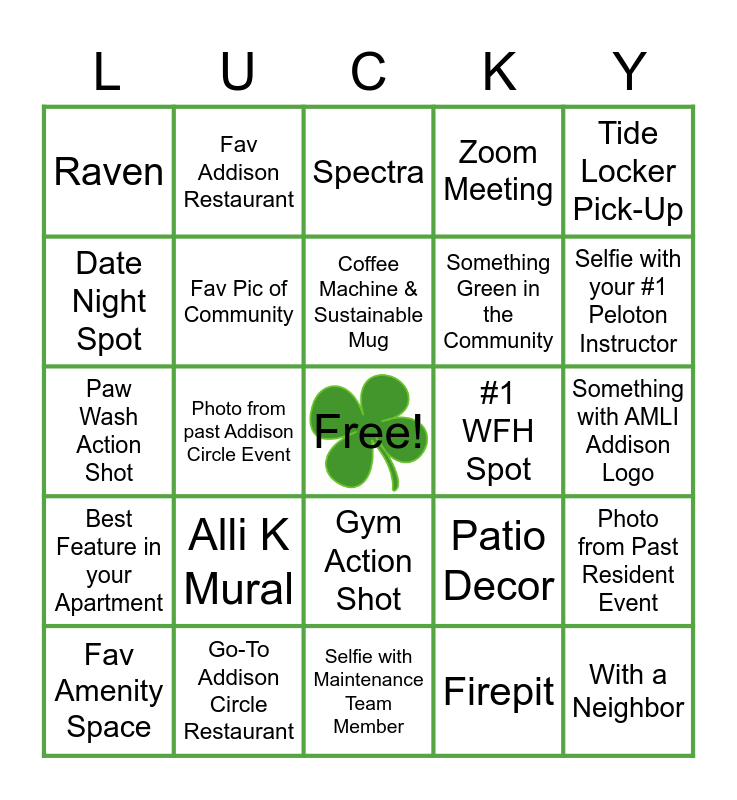 This bingo card has a free space and 24 words: Alli K Mural, Go-To Addison Circle Restaurant, Coffee Machine & Sustainable Mug, Fav Amenity Space, Tide Locker Pick-Up, Raven, Date Night Spot, Fav Addison Restaurant, #1 WFH Spot, Gym Action Shot, Something Green in the Community, Paw Wash Action Shot, Patio Decor, Photo from Past Resident Event, Fav Pic of Community, Firepit, Something with AMLI Addison Logo, Spectra, Selfie with your #1 Peloton Instructor, Photo from past Addison Circle Event, With a Neighbor, Best Feature in your Apartment, Zoom Meeting and Selfie with Maintenance Team Member.