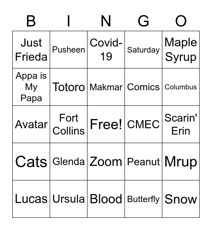 This bingo card has a free space and 24 words: Glenda, Ursula, Makmar, Lucas, Maple Syrup, Just Frieda, Appa is My Papa, Pusheen, CMEC, Zoom, Comics, Avatar, Peanut, Mrup, Totoro, Butterfly, Scarin' Erin, Covid-19, Columbus, Fort Collins, Snow, Cats, Saturday and Blood.