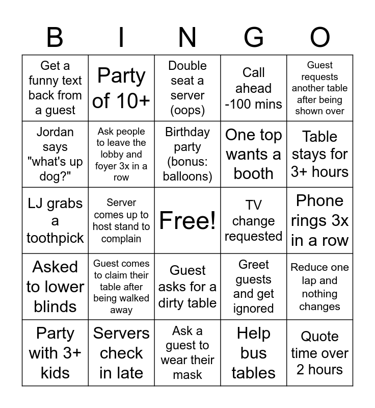 This bingo card has a free space and 31 words: Ask a guest to wear their mask, Guest asks for a closed table, Server comes up to host stand to complain, Print more beer menus, Get a funny text back from a guest, Double seat a server (oops), Ask people to leave the lobby and foyer 3x in a row, Greet guests and get ignored, TV change requested, Help bus tables, Phone rings 3x in a row, Quote time over 2 hours, Call ahead over 5, Get 2 roll ups at once, Table stays for 3+ hours, Someone from the kitchen comes to look at the wait, Reduce one lap and nothing changes, Guest comes to claim their table after being walked away, Asked to lower blinds, Guest asks for a dirty table, Guest requests another table after being shown over, A manager helps to seat, Party with 3+ kids, Party of 10+, One top wants a booth, Jordan says "what's up dog?", Call ahead -100 mins, LJ grabs a toothpick, Servers check in late, Birthday party (bonus: balloons) and Guest is shocked at wait time.