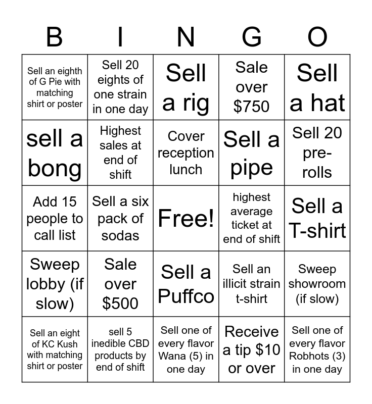 This bingo card has a free space and 24 words: Sale over $500, sell 5 inedible CBD products by end of shift, Cover reception lunch, Sell an eight of KC Kush with matching shirt or poster, Sell a hat, Sell an eighth of G Pie with matching shirt or poster, sell a bong, Sell 20 eights of one strain in one day, highest average ticket at end of shift, Sell a Puffco, Sell a pipe, Add 15 people to call list, Sell an illicit strain t-shirt, Sweep showroom (if slow), Highest sales at end of shift, Receive a tip $10 or over, Sell a T-shirt, Sell a rig, Sell 20 pre-rolls, Sell a six pack of sodas, Sell one of every flavor Robhots (3) in one day, Sweep lobby (if slow), Sale over $750 and Sell one of every flavor Wana (5) in one day.