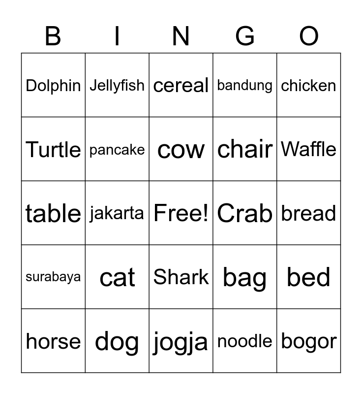 This bingo card has a free space and 24 words: cat, dog, cow, horse, chicken, Dolphin, Turtle, Jellyfish, Crab, Shark, chair, table, bag, bed, pancake, noodle, bread, cereal, Waffle, jakarta, bogor, surabaya, bandung and jogja.