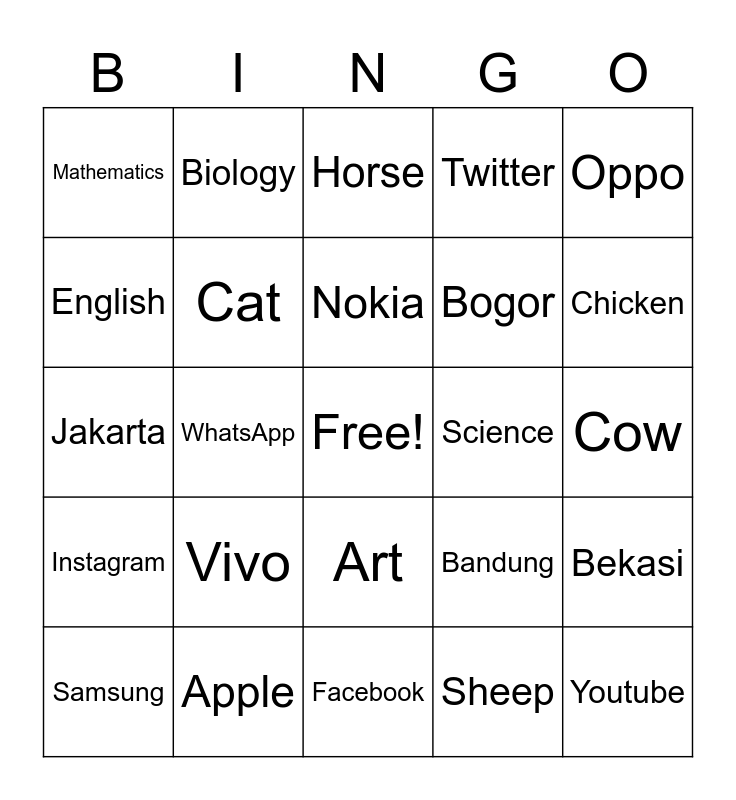 This bingo card has a free space and 24 words: Vivo, Apple, Nokia, Samsung, Oppo, Mathematics, English, Biology, Science, Art, Bogor, Jakarta, Bandung, Bekasi, Cat, Sheep, Cow, Horse, Chicken, WhatsApp, Youtube, Instagram, Twitter and Facebook.
