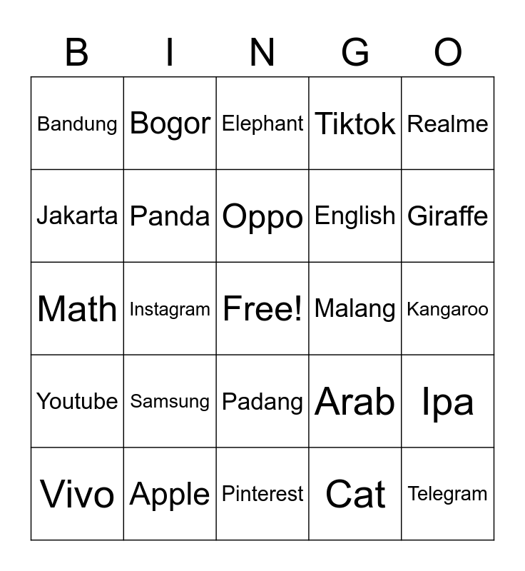 This bingo card has a free space and 24 words: Samsung, Apple, Oppo, Vivo, Realme, Bandung, Jakarta, Bogor, Malang, Padang, English, Math, Arab, Ipa, Panda, Cat, Kangaroo, Elephant, Giraffe, Instagram, Telegram, Youtube, Tiktok and Pinterest.