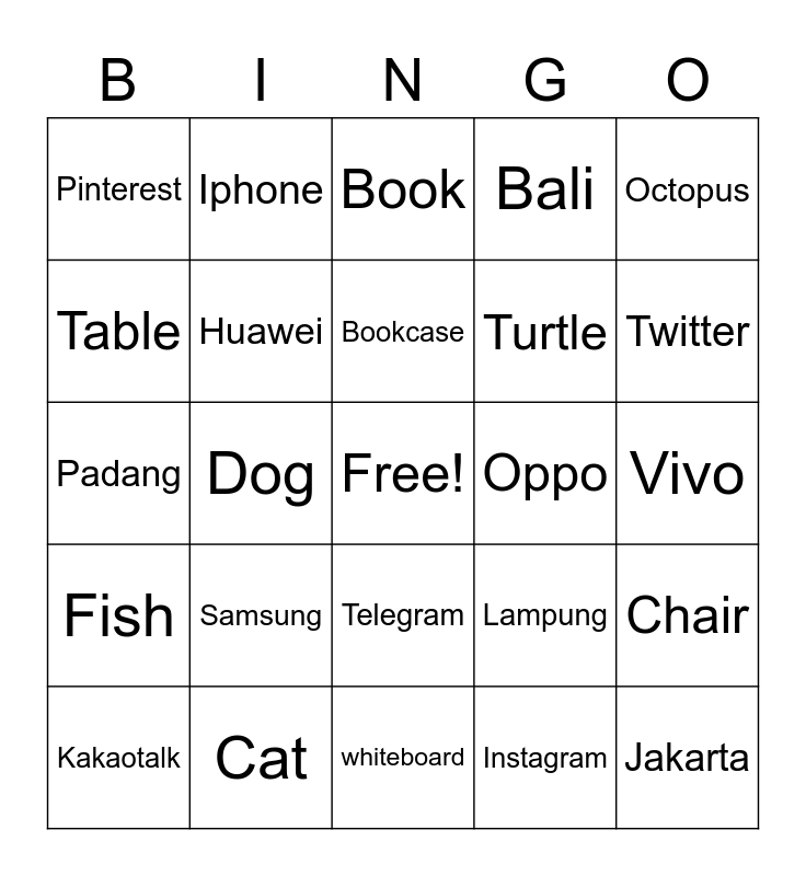 This bingo card has a free space and 24 words: Samsung, Cat, Bookcase, Kakaotalk, Octopus, Pinterest, Table, Iphone, Oppo, Telegram, Turtle, Padang, Lampung, Chair, Huawei, Instagram, Vivo, Book, Twitter, Dog, Jakarta, Fish, Bali and whiteboard.