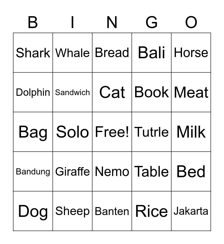 This bingo card has a free space and 24 words: Giraffe, Sheep, Cat, Dog, Horse, Shark, Dolphin, Whale, Tutrle, Nemo, Book, Bag, Table, Bed, Sandwich, Rice, Milk, Bread, Meat, Solo, Jakarta, Bandung, Bali and Banten.