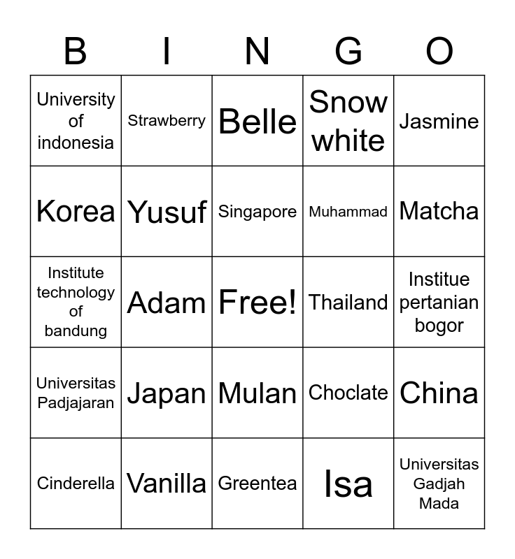 This bingo card has a free space and 24 words: Japan, Vanilla, Singapore, Cinderella, Jasmine, University of indonesia, Korea, Strawberry, Thailand, Mulan, Muhammad, Institute technology of bandung, Choclate, China, Yusuf, Isa, Institue pertanian bogor, Belle, Matcha, Adam, Universitas Gadjah Mada, Universitas Padjajaran, Snow white and Greentea.