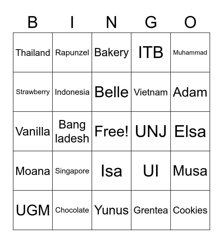 This bingo card has a free space and 24 words: Singapore, Chocolate, Belle, UGM, Muhammad, Thailand, Strawberry, Rapunzel, UNJ, Isa, Vietnam, Vanilla, UI, Musa, Indonesia, Grentea, Elsa, Bakery, Adam, Bang ladesh, Cookies, Moana, ITB and Yunus.