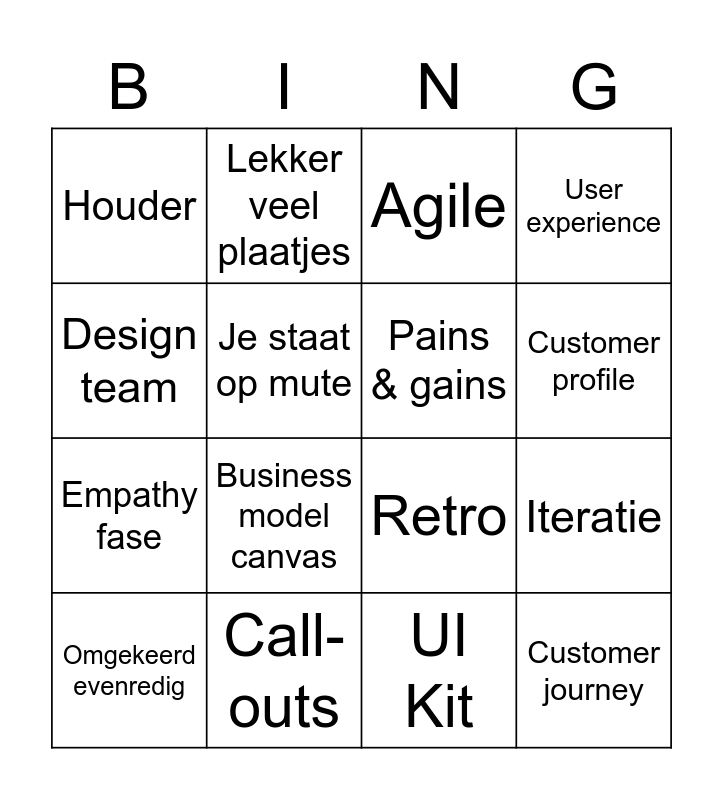 This bingo card has 16 words: Call-outs, Iteratie, Agile, Houder, Empathy fase, Lekker veel plaatjes, Retro, UI Kit, Design team, Je staat op mute, Omgekeerd evenredig, User experience, Business model canvas, Customer profile, Pains & gains and Customer journey.