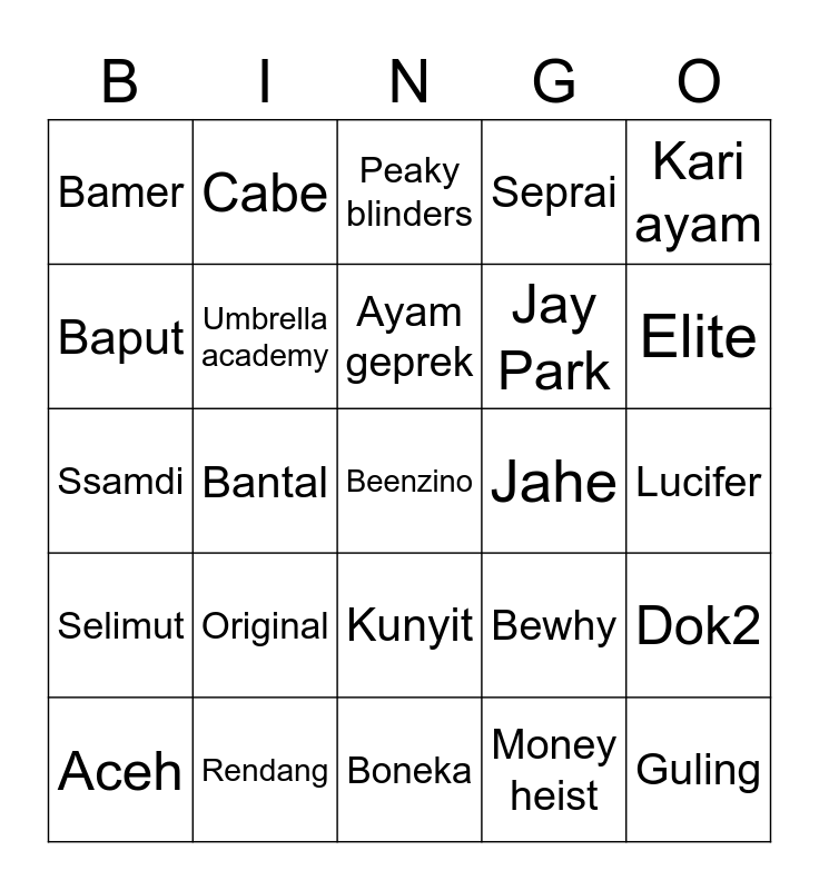 This bingo card has a free space and 24 words: Original, Rendang, Ayam geprek, Aceh, Kari ayam, Bamer, Baput, Cabe, Jahe, Kunyit, Jay Park, Ssamdi, Bewhy, Dok2, Umbrella academy, Money heist, Lucifer, Peaky blinders, Elite, Bantal, Guling, Selimut, Seprai and Boneka.