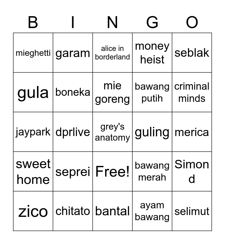 This bingo card has 26 words: Free!, ayam bawang, mie goreng, chitato, seblak, mieghetti, gula, garam, merica, bawang merah, bawang putih, jaypark, Simon d, zico, dprlive, ph-1, money heist, sweet home, alice in borderland, grey's anatomy, criminal minds, bantal, guling, seprei, boneka and selimut.