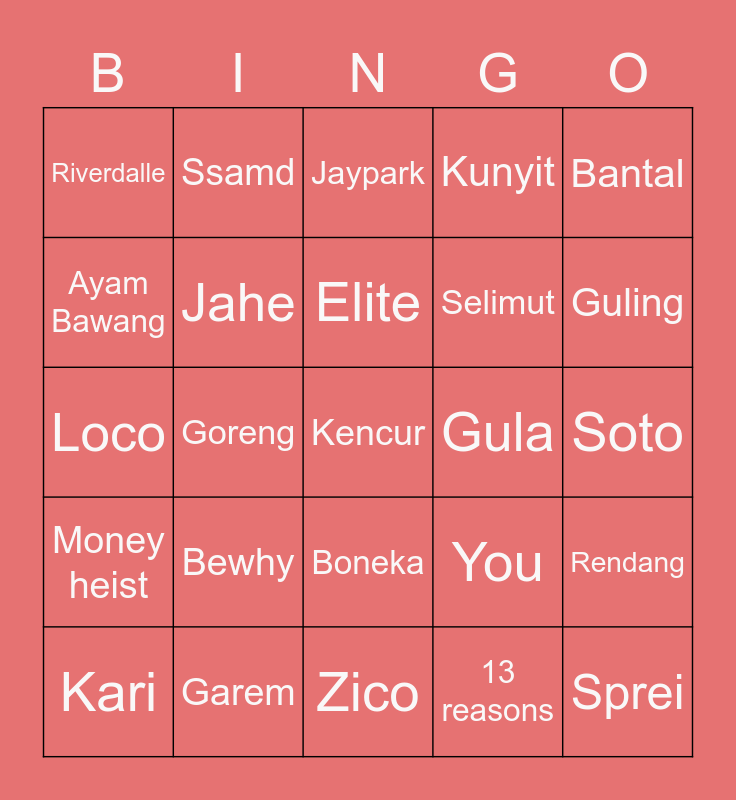 This bingo card has a free space and 24 words: Bewhy, Garem, Elite, Kari, Bantal, Riverdalle, Ayam Bawang, Ssamd, Gula, Boneka, Selimut, Loco, You, Rendang, Jahe, 13 reasons, Soto, Jaypark, Guling, Goreng, Sprei, Money heist, Kunyit and Zico.