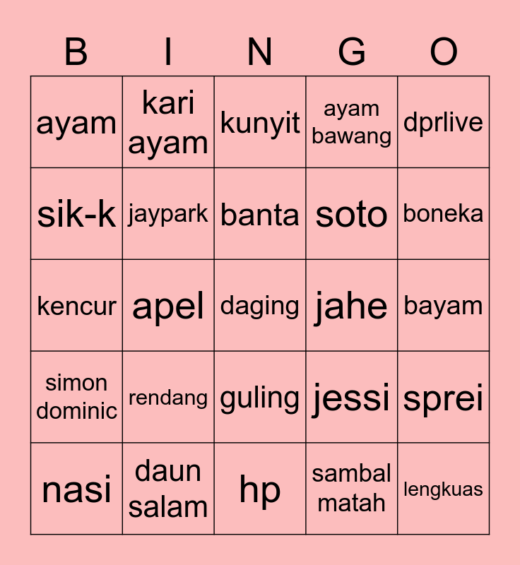 This bingo card has a free space and 24 words: rendang, daun salam, banta, nasi, dprlive, ayam, sik-k, kari ayam, jahe, guling, soto, kencur, jessi, sprei, jaypark, sambal matah, bayam, kunyit, boneka, apel, lengkuas, simon dominic, ayam bawang and hp.