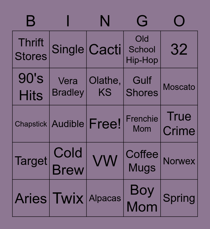 This bingo card has a free space and 24 words: Aries, Cold Brew, Olathe, KS, Boy Mom, 32, Thrift Stores, Single, Cacti, Frenchie Mom, True Crime, Chapstick, Vera Bradley, Coffee Mugs, Norwex, 90's Hits, Twix, Alpacas, Old School Hip-Hop, Moscato, Target, Audible, VW, Gulf Shores and Spring.