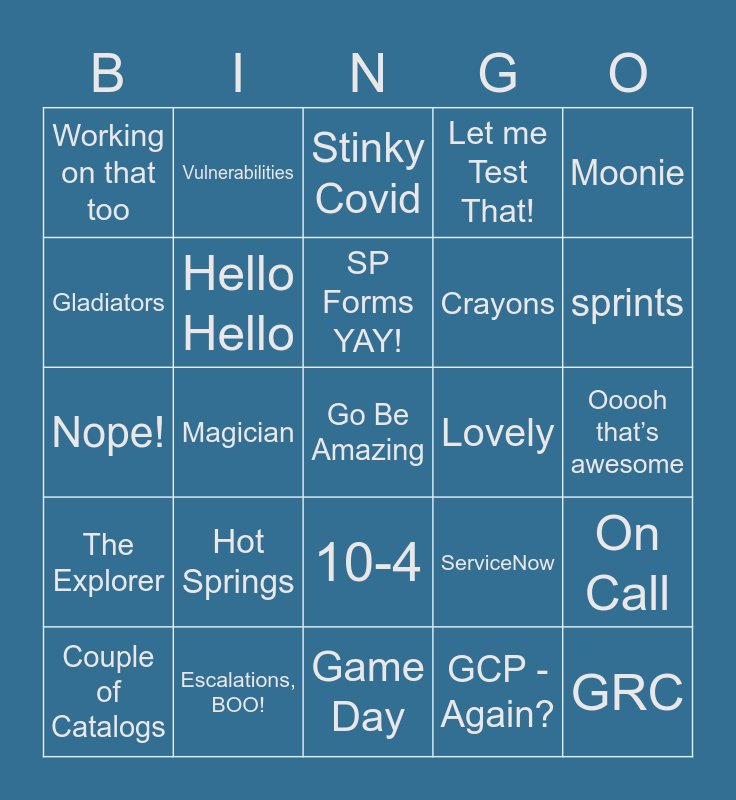This bingo card has 39 words: Fabulosity, Bama, McDonalds, Hello Hello, Couple of Catalogs, 10-4, SP Forms YAY!, Big Toe, Moonie, The Explorer, Magician, Let me Test That!, Go Be Amazing, Ooooh that’s awesome, Lovely, Hot Springs, Just gimme 2 min, Working on that too, API Mastermind, ServiceNow, Gladiators, Game Day, Crayons, sprints, HR, FedRAMP, GRC, ITAM, CMDB, Vulnerabilities, Test Scripts, Smoke Test, Stinky Covid, Escalations, BOO!, GCP - Again?, Deployments, On Call, Nope! and What’s the priority?.