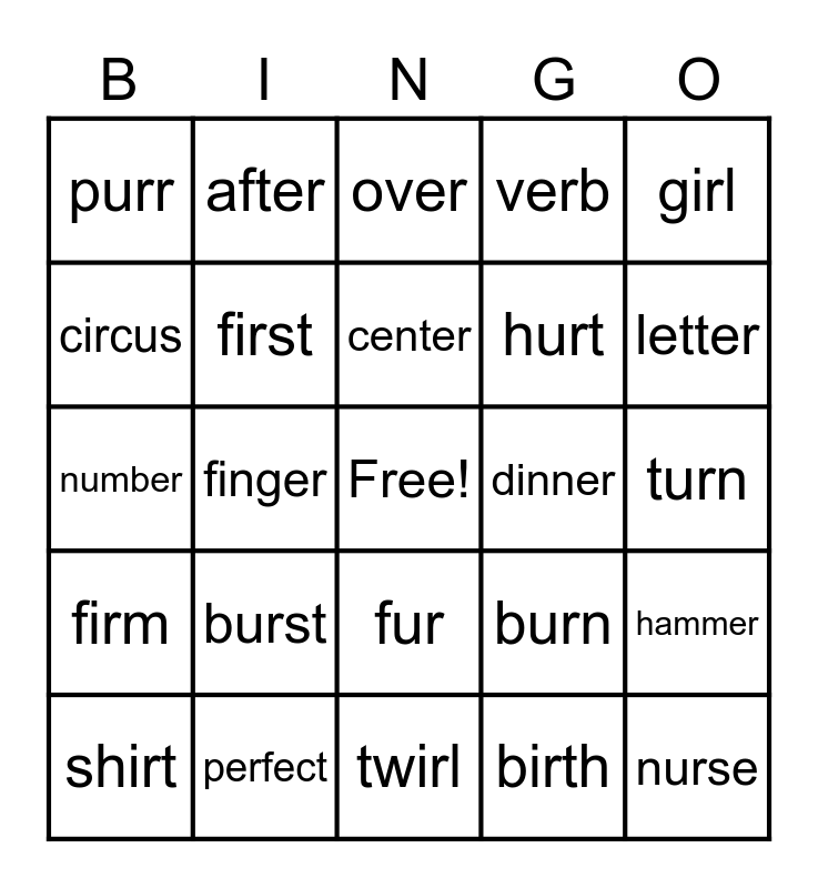 This bingo card has a free space and 34 words: bird, birth, chirp, dirt, firm, first, girl, shirt, after, butter, center, over, under, her, dinner, letter, perfect, number, burst, burn, fur, purse, purr, turn, twirl, nurse, verb, serve, hurt, circus, sir, finger, hammer and surprise.