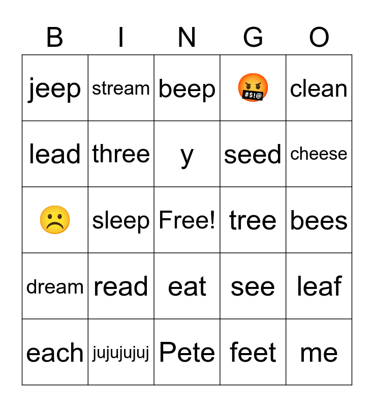 This bingo card has a free space and 31 words: Pete, need, sleep, sheep, jeep, beep, three, see, tree, feet, bees, me, she, keep, cheese, cheek, leaf, read, dream, eat, clean, beach, each, stream, seed, lead, 🤬, ☹️, jujujujuj, y and t.