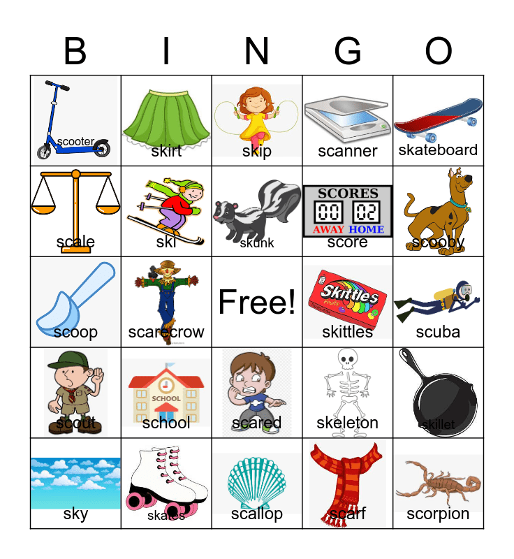 This bingo card has 24 images, a free space and 24 words: school, skates, skunk, sky, skateboard, scooter, scale, skirt, skittles, scared, score, scoop, skeleton, skillet, ski, scarf, scuba, skip, scooby, scarecrow, scorpion, scout, scanner and scallop.