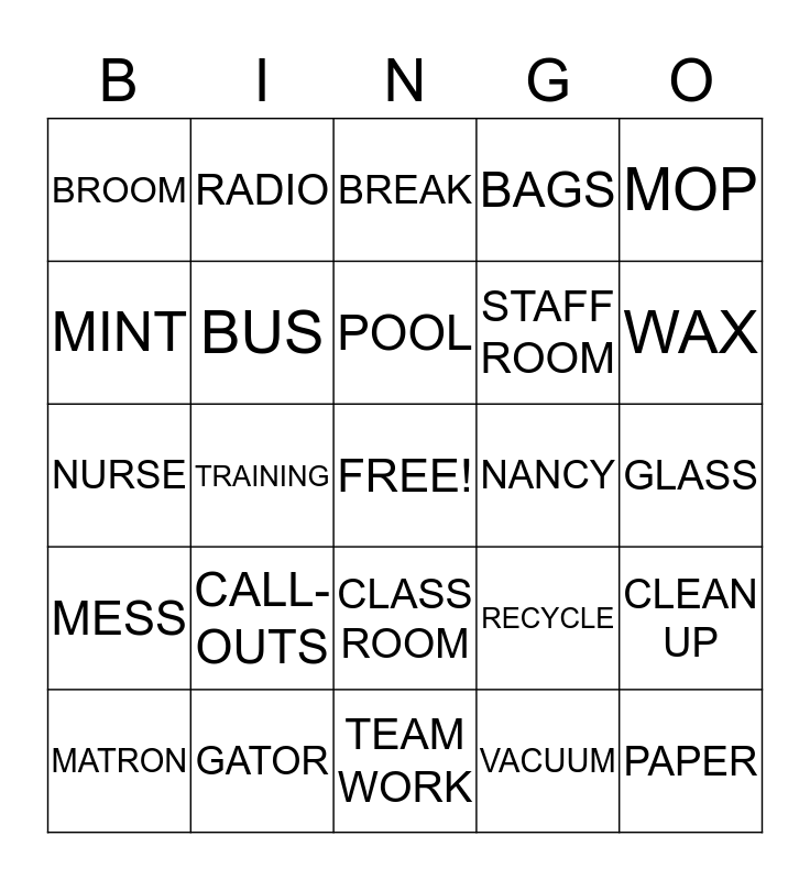 This bingo card has a free space and 24 words: CALL-OUTS, GATOR, POOL, MATRON, MOP, BROOM, MINT, RADIO, NANCY, CLASS ROOM, STAFF ROOM, NURSE, RECYCLE, CLEAN UP, BUS, VACUUM, GLASS, BREAK, WAX, TRAINING, PAPER, MESS, BAGS and TEAM WORK.