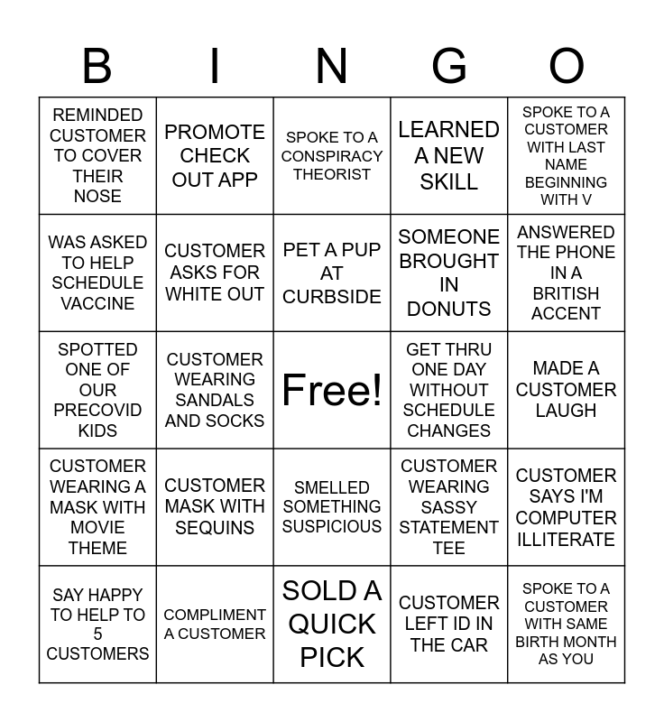 This bingo card has a free space and 24 words: CUSTOMER MASK WITH SEQUINS, COMPLIMENT A CUSTOMER, PET A PUP AT CURBSIDE, SAY HAPPY TO HELP TO 5 CUSTOMERS, SPOKE TO A CUSTOMER WITH LAST NAME BEGINNING WITH V, REMINDED CUSTOMER TO COVER THEIR NOSE, WAS ASKED TO HELP SCHEDULE VACCINE, PROMOTE CHECK OUT APP, GET THRU ONE DAY WITHOUT SCHEDULE CHANGES, SMELLED SOMETHING SUSPICIOUS, SOMEONE BROUGHT IN DONUTS, SPOTTED ONE OF OUR PRECOVID KIDS, CUSTOMER WEARING SASSY STATEMENT TEE, CUSTOMER SAYS I'M COMPUTER ILLITERATE, CUSTOMER ASKS FOR WHITE OUT, CUSTOMER LEFT ID IN THE CAR, MADE A CUSTOMER LAUGH, SPOKE TO A CONSPIRACY THEORIST, ANSWERED THE PHONE IN A BRITISH ACCENT, CUSTOMER WEARING SANDALS AND SOCKS, SPOKE TO A CUSTOMER WITH SAME BIRTH MONTH AS YOU, CUSTOMER WEARING A MASK WITH MOVIE THEME, LEARNED A NEW SKILL and SOLD A QUICK PICK.