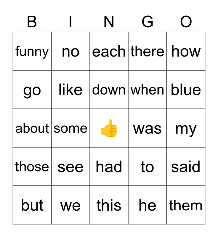 This bingo card has a free space and 24 words: see, we, down, but, how, funny, go, no, was, had, when, about, to, said, like, he, my, each, blue, some, them, those, there and this.