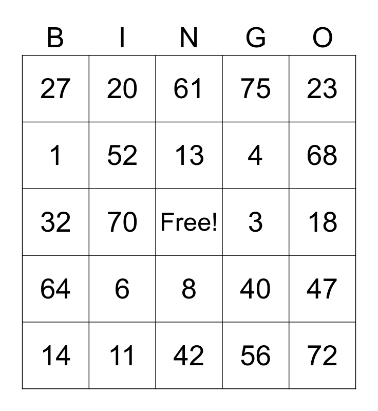 This bingo card has a free space and 24 words: 6, 11, 13, 14, 23, 27, 1, 20, 3, 8, 4, 32, 40, 47, 52, 56, 18, 61, 68, 70, 72, 64, 75 and 42.