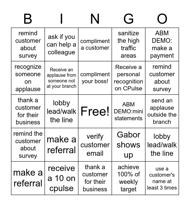 This bingo card has a free space and 24 words: make a referral, receive a 10 on cpulse, compliment your boss!, make a referral, ABM DEMO: make a payment, remind customer about survey, recognize someone on applause, ask if you can help a colleague, ABM DEMO:mini statements, verify customer email, Receive a personal recognition on CPulse, thank a customer for their business, Gabor shows up, lobby lead/walk the line, Receive an applause from someone not at your branch, achieve 100% of weekly target, send an applause outside the branch, compliment a customer, remind customer about survey, lobby lead/walk the line, use a customer's name at least 3 times, remind the customer about survey, sanitize the high traffic areas and thank a customer for their business.