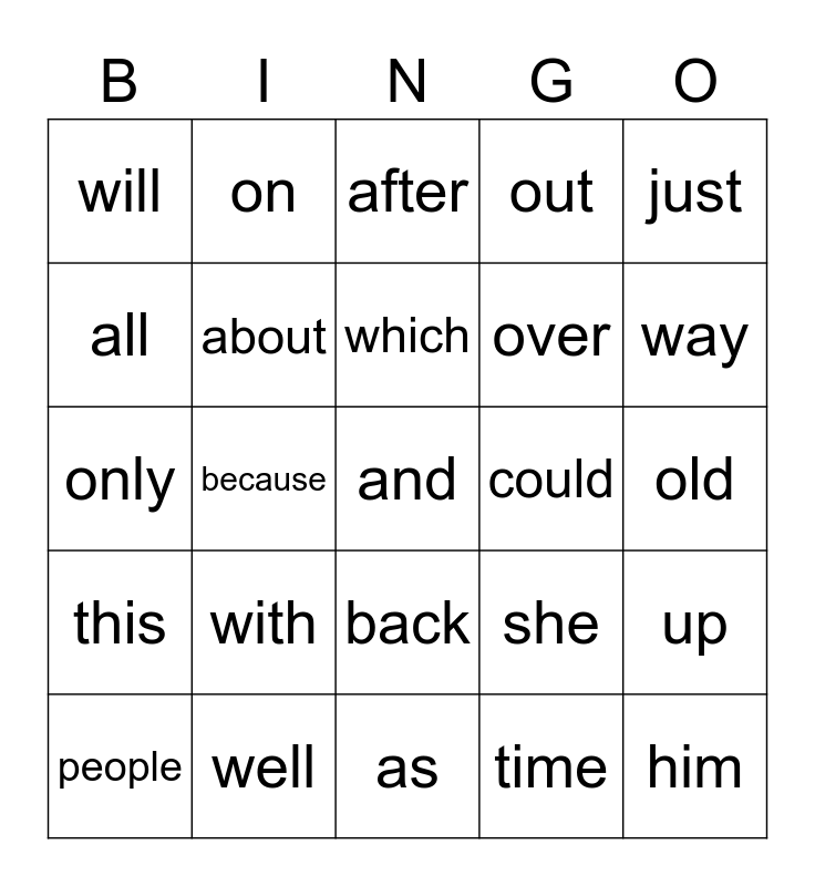 This bingo card has 50 words: the, and, you, as, with, be, on, by, all, can, about, out, up, she, them, your, which, could, may, just, because, time, will, over, very, him, way, my, after, back, such, must, good, use, well, right, away, every, came, old, here, does, say, few, people, only, work, from, this and were.