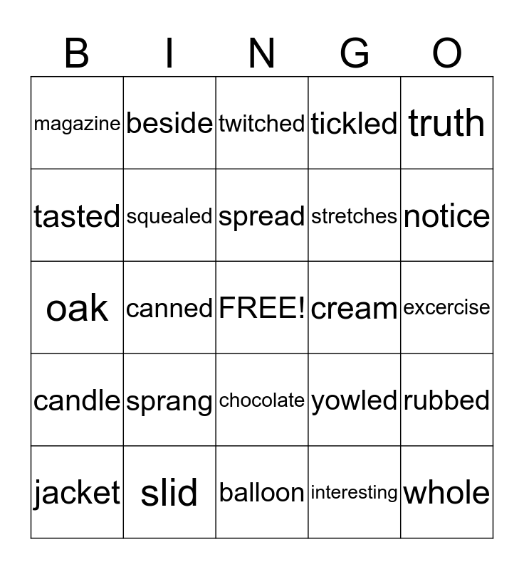 This bingo card has a free space and 24 words: sprang, slid, spread, jacket, truth, magazine, tasted, beside, cream, chocolate, stretches, oak, yowled, rubbed, squealed, interesting, excercise, twitched, notice, canned, whole, candle, tickled and balloon.