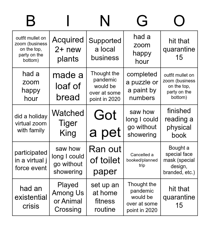 ⚠ This card has duplicate items: had an existential crisis (2), wore same outfit twice consecutively (2), outfit mullet on zoom (business on the top, party on the bottom) (2), set up an at home fitness routine (2), binge a show with at least 3 seasons (2), made a loaf of bread (2), redecorated a room in your home (2), completed a puzzle or a paint by numbers (2), finished reading a physical book (2), had a zoom happy hour (2), did a holiday virtual zoom with family (2), Revisited a childhood favorite videogame that I haven't played in years (2), participated in a virtual j force event (2), Acquired 2+ new plants (2), Ran out of toilet paper (2), hit that quarantine 15 (2), Watched Tiger King (2), At-Home Haircut (2), Got a pet (2), saw how long I could go without showering (2), Played Among Us or Animal Crossing (2), Cancelled a booked/planned trip (2), Supported a local business (2), took up a new hobby that you are STILL doing (2), Thought the pandemic would be over at some point in 2020 (2)