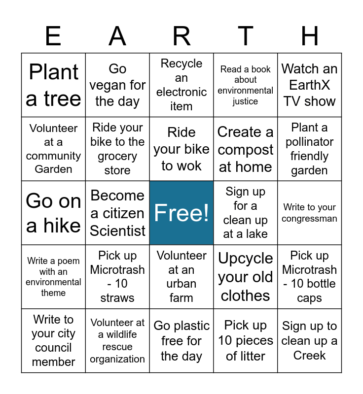 This bingo card has a free space and 25 words: Pick up Microtrash - 10 straws, Go plastic free for the day, Ride your bike to wok, Write to your city council member, Watch an EarthX TV show, Plant a tree, Volunteer at a community Garden, Go vegan for the day, Sign up for a clean up at a lake, Volunteer at an urban farm, Create a compost at home, Go on a hike, Upcycle your old clothes, Pick up Microtrash - 10 bottle caps, Ride your bike to the grocery store, Use reusable bags for groceries, Write to your congressman, Recycle an electronic item, Plant a pollinator friendly garden, Become a citizen Scientist, Sign up to clean up a Creek, Volunteer at a wildlife rescue organization, Write a poem with an environmental theme, Read a book about environmental justice and Pick up 10 pieces of litter.