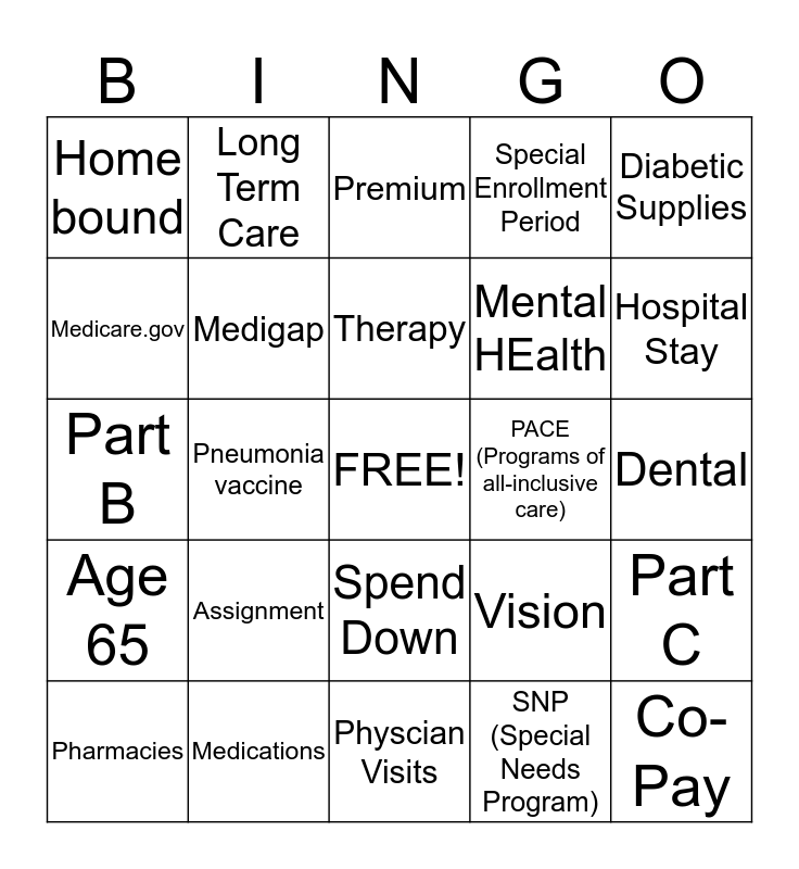 This bingo card has a free space and 26 words: Spend Down, SNP (Special Needs Program), Therapy, Medications, Diabetic Supplies, Home bound, Medicare.gov, Long Term Care, Dental, Vision, Mental HEalth, Part B, Part C, Pharmacies, Pneumonia vaccine, Depression Screen, Special Enrollment Period, Age 65, Premium, Co-Pay, Hospital Stay, Physcian Visits, PACE (Programs of all-inclusive care), Assignment, Medigap and Wellness Check Up.