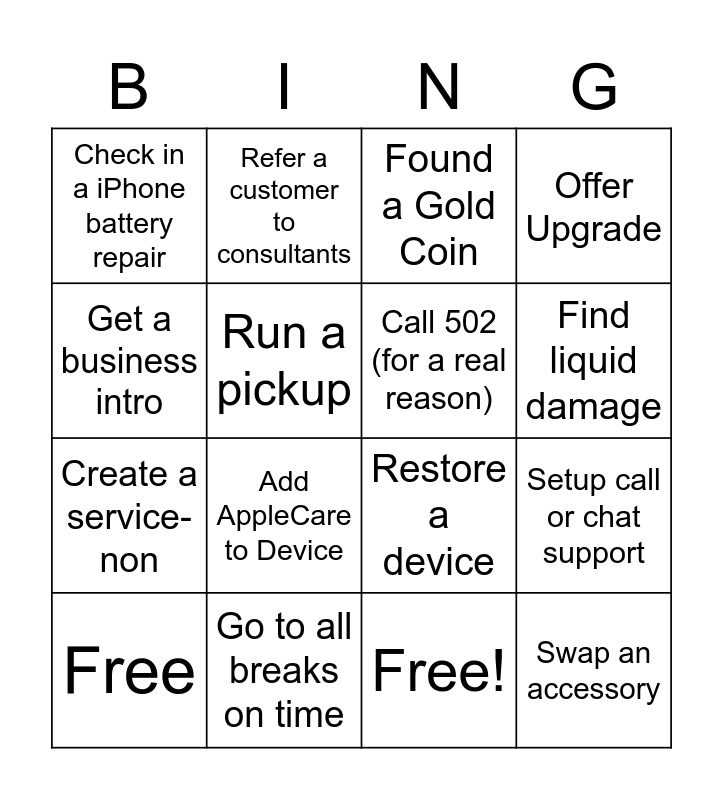 This bingo card has 17 words: Free!, Free, Found a Gold Coin, Check in a iPhone battery repair, Add AppleCare to Device, Offer Upgrade, Setup call or chat support, Call 502 (for a real reason), Find liquid damage, Run a pickup, Go to all breaks on time, Restore a device, Get a business intro, Refer a customer to consultants, Create a service-non, Sell an accessory and Swap an accessory.