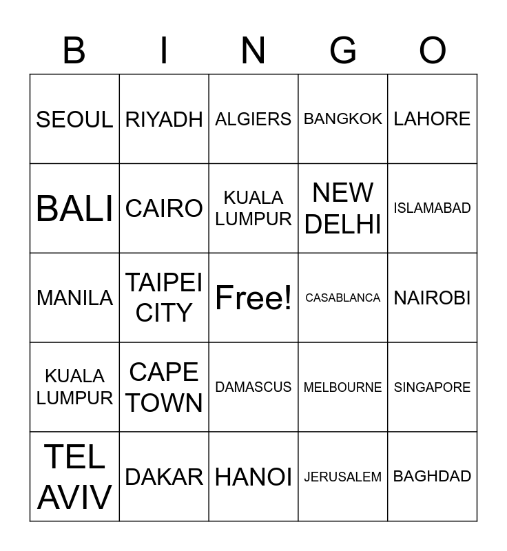 This bingo card has a free space and 29 words: TEL AVIV, TOKYO, TAIPEI CITY, SHANGHAI, SEOUL, ALGIERS, CAIRO, CAPE TOWN, CASABLANCA, DAKAR, NAIROBI, BAGHDAD, HANOI, JERUSALEM, ISLAMABAD, HONG KONG, DAMASCUS, KUALA LUMPUR, LAHORE, MANILA, MELBOURNE, MUMBAI, NEW DELHI, BALI, BANGKOK, RIYADH, SINGAPORE, KUALA LUMPUR and I'D LIKE TO VISIT----.