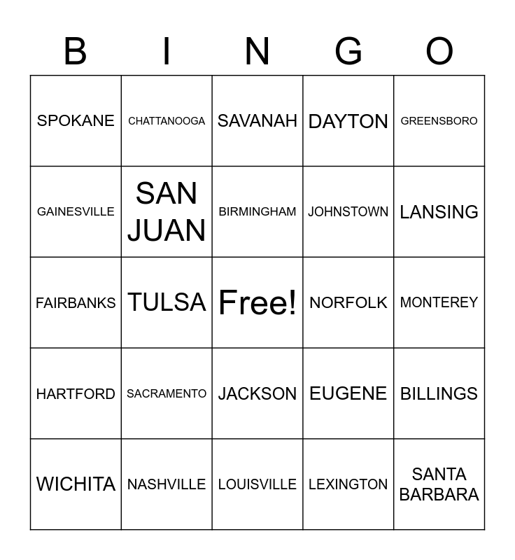 This bingo card has a free space and 29 words: WICHITA, WACO, TULSA, TAMPA, SPOKANE, SAVANAH, SAN JUAN, SACRAMENTO, NORFOLK, NASHVILLE, MONTEREY, SANTA BARBARA, LOUISVILLE, LEXINGTON, LANSING, KNOXVILLE, JACKSON, HARTFORD, GREENSBORO, FAIRBANKS, EUGENE, FARGO, JOHNSTOWN, GAINESVILLE, DAYTON, CHATTANOOGA, BILLINGS, BIRMINGHAM and NEWARK.
