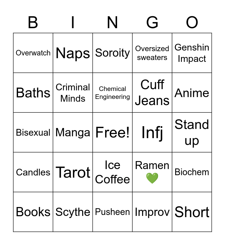 This bingo card has a free space and 24 words: Tarot, Scythe, Chemical Engineering, Books, Genshin Impact, Overwatch, Baths, Naps, Infj, Ice Coffee, Cuff Jeans, Bisexual, Ramen💚, Biochem, Criminal Minds, Improv, Stand up, Soroity, Anime, Manga, Short, Candles, Oversized sweaters and Pusheen.