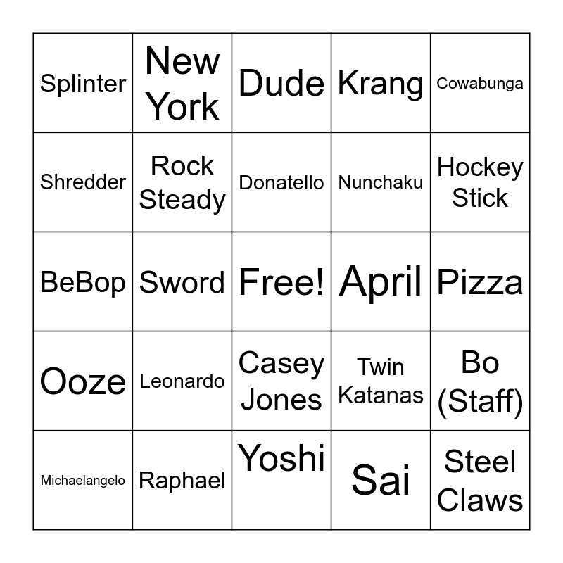 This bingo card has a free space and 24 words: Leonardo, Raphael, Donatello, Michaelangelo, Cowabunga, Splinter, Shredder, New York, April, Casey Jones, Nunchaku, BeBop, Twin Katanas, Bo (Staff), Rock Steady, Sai, Pizza, Dude, Hockey Stick, Sword, Steel Claws, Ooze, Krang and Yoshi.